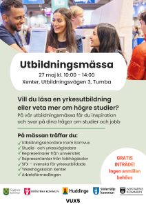 Mässan äger rum onsdag 27 maj kl. 10:00 – 14:00 i Xenter, Utbildningsvägen 3 i Tumba.